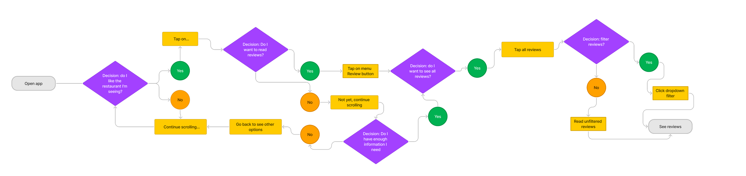 We recreated the current user flow from the OpenTable app to help us visualize the steps a user takes to accomplish a task or achieve a goal within the app. This information is helpful in several ways.