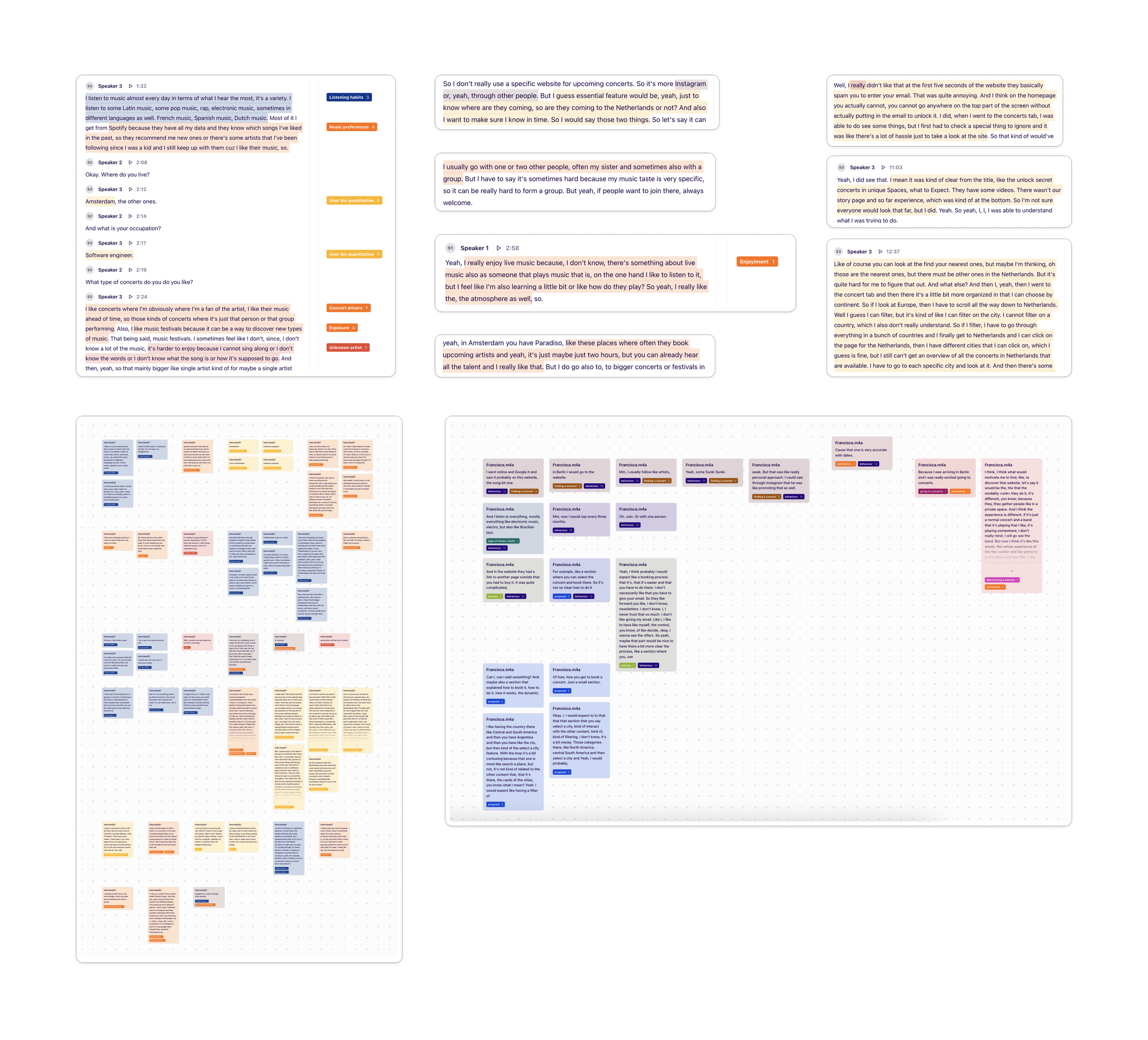 Highlighting nuggets and creating affinity maps during ideation helped us organize and categorize user research information. The key learnings from the tagging taxonomy interviews suggest that personalized experiences, atmosphere, and exposure to new music and talent are primary motivators for people attending concerts. They typically purchase tickets from venues or known ticket seller platforms and find out about concerts through social media. Inhibitors to attending concerts, such as cost or lack of interest in the lineup, were mentioned in some interviews but may be less significant in this concert-goer group.